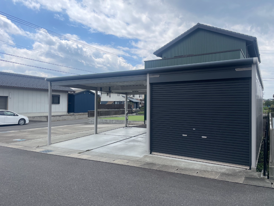 仕事で大工をされているということで、道具が安心して収納できて、車2台駐車できるカーポートがご希望ということで提案させていただきました。ガレージ側面壁に引戸を取付、毎日の道具の収納もわざわざ正面シャッターを開けなくても気軽に行えますね!