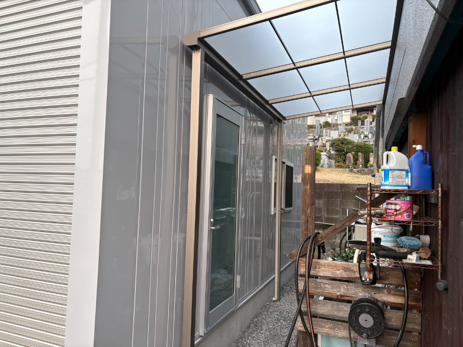 あわせて、三協アルミのテラス「レボリューA F型」を施工。雨の日や日差しをしっかりと遮り、荷物の一時置きや作業スペースとしても活用できる実用的な空間を確保しました。建物との調和も意識し、機能性とデザイン性を両立しています。